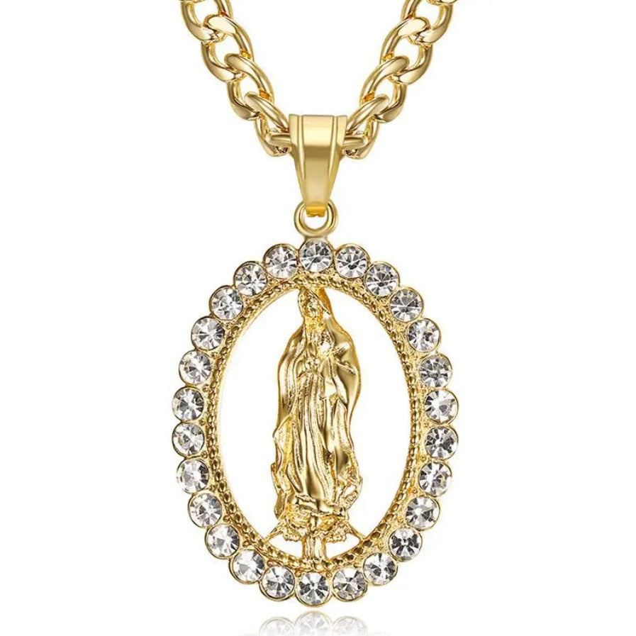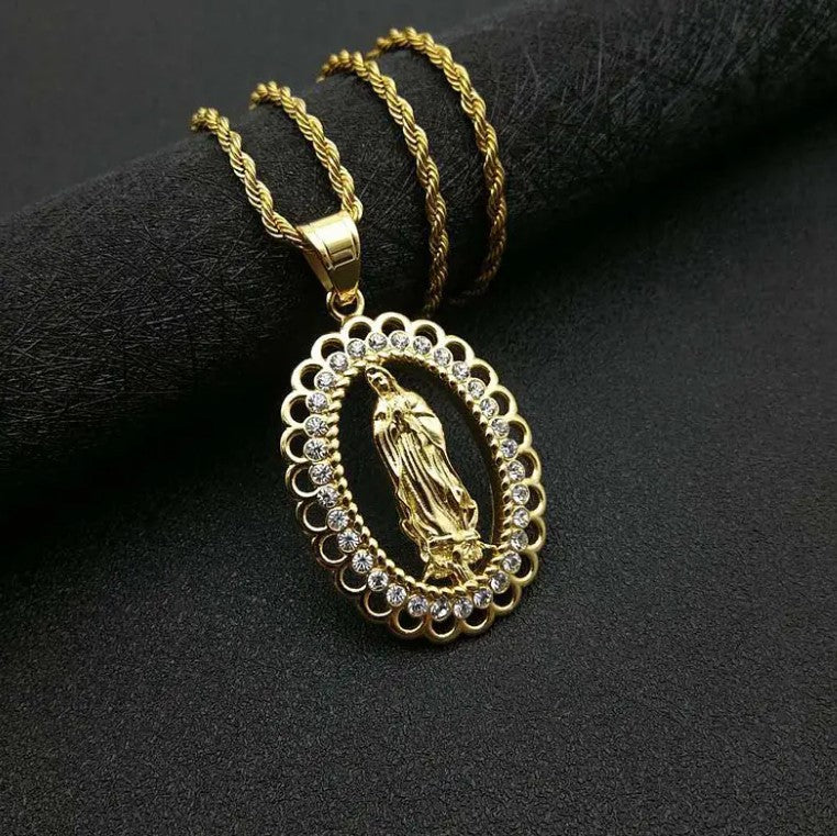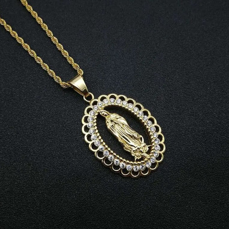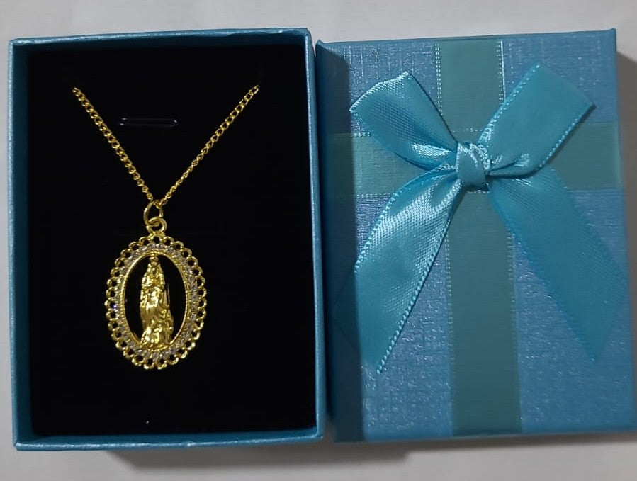 El collar presenta una hermosa medalla de la Santa Virgen María, un símbolo de fe y protección. Su diseño detallado y meticuloso resalta la figura de la Virgen, ofreciendo no solo una pieza de joyería, sino también un recordatorio constante de amor y espiritualidad. Este collar es perfecto para quienes buscan llevar consigo un símbolo de su fe de una manera elegante y discreta.