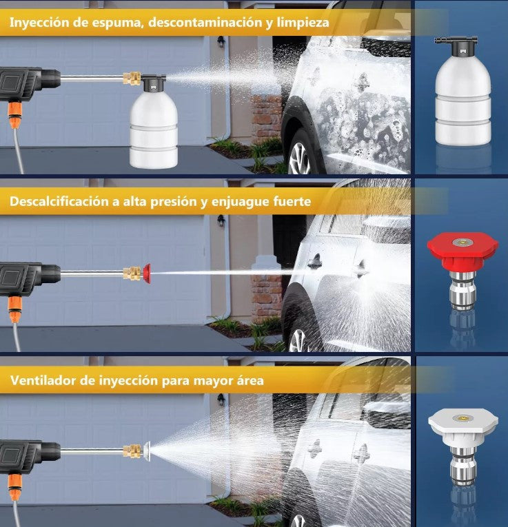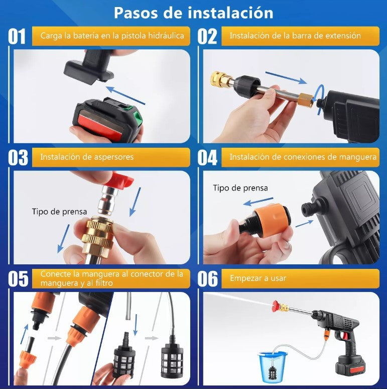 Características:-Diseño inalámbrico, alimentado por batería recargable de iones de litio, conveniente para trabajar al aire libre-El Sistema de Control de configuración de presión dual alta/Baja equilibra el tiempo de funcionamiento con la presión del agua-Boquilla multifunción con 3 patrones de pulverización para limpieza eléctrica o riego-Accesorio de conexión rápida universal de 1/4 "para varias extensiones de boquilla-No se requiere manguera de jardín, soporte para extraer agua dulce del cubo, botella, Arroyo o piscinaEl paquete incluye:1 x hidro lavadora 2 /batería 48v1 cargador de batería1 tubería de agua de 5m1 boquilla de 0 °1 x boquilla de 40 °1 x varilla de extensión1 x filtro1 x bote de espuma
