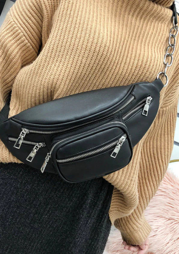 Un diseño clásico y muy rock star, riñonera con cuatro bolsillo externos con cierre, compartimento principal con cierre, correa de tela con detalle de cadena plateada en un extremo de la misma, correa fija y graduable.
