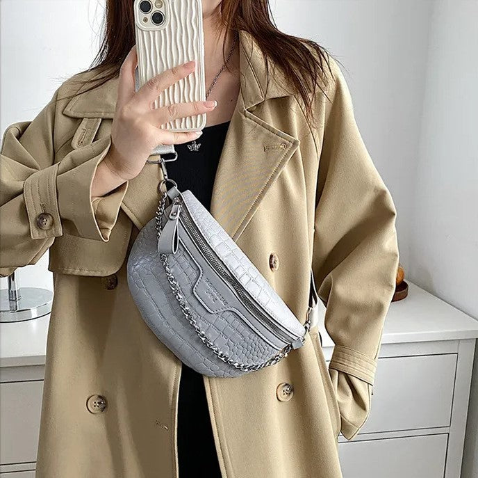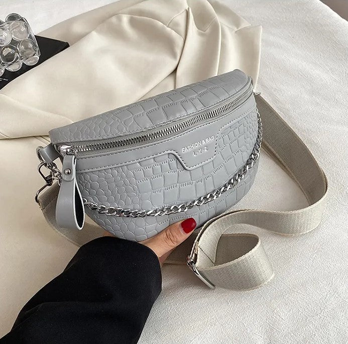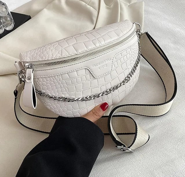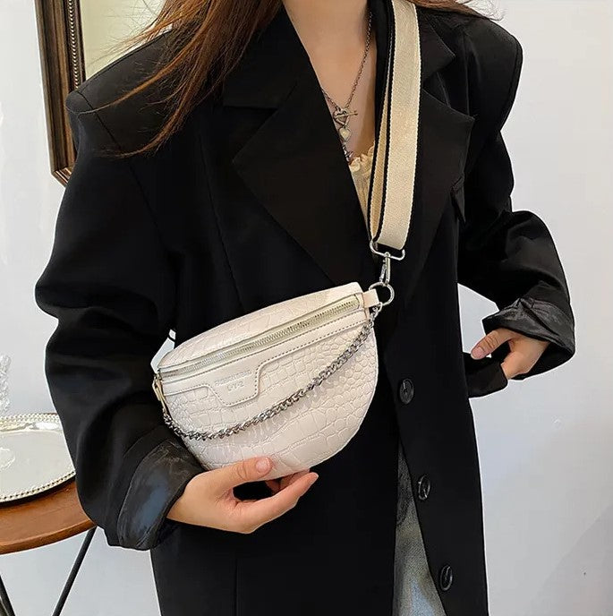 Riñonera con textura tipo piel, cadena delantera decorativa que también puedes usar como asa, compartimento principal con cierre, bolsillo interno, correa gruesa de tela graduable y removible.
