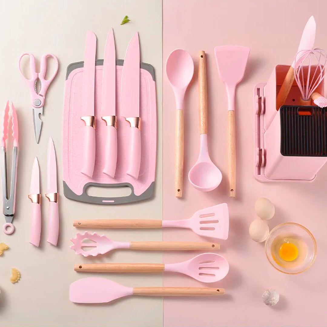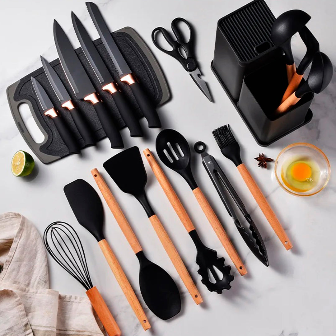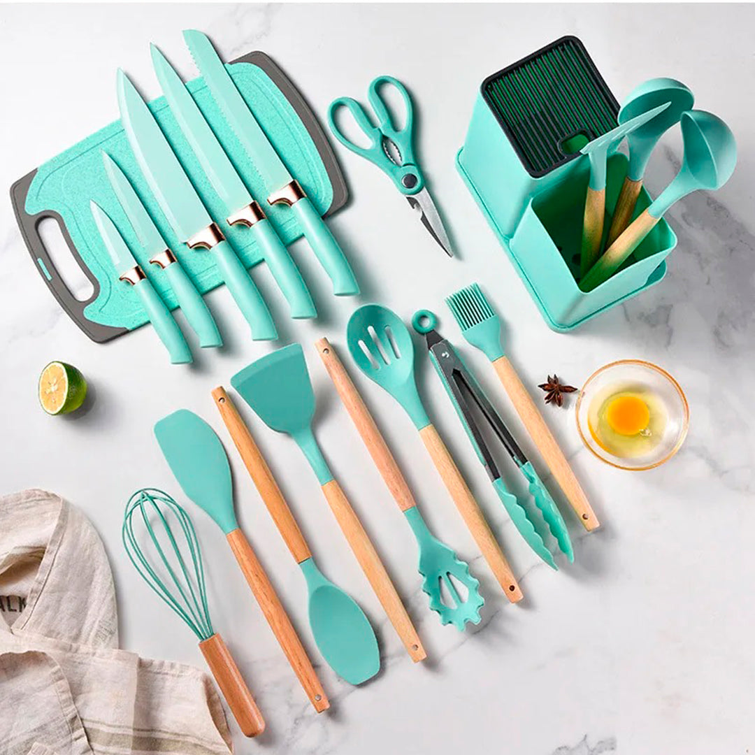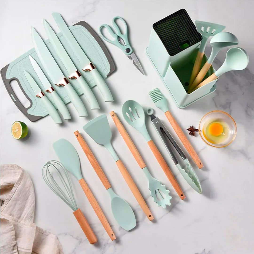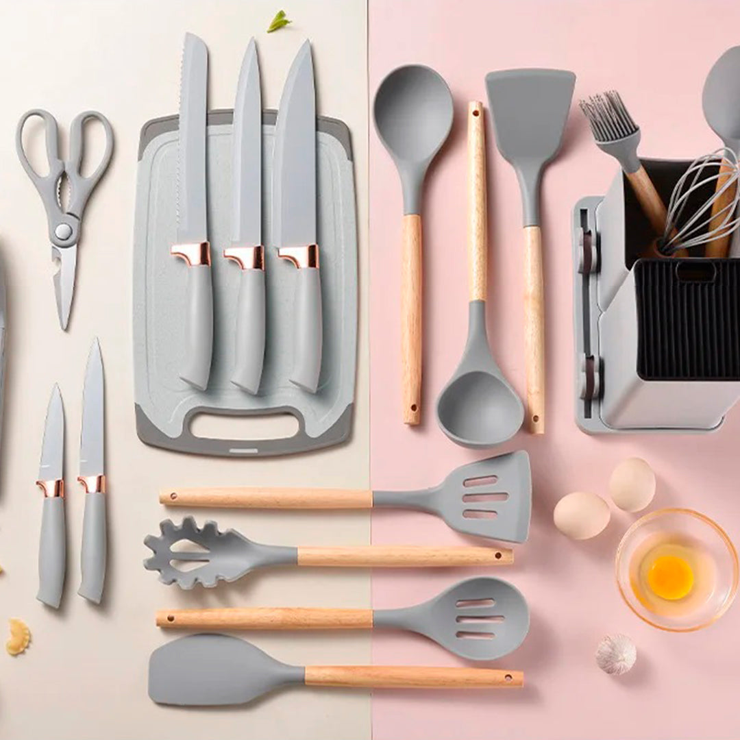 Juego de utensilios de Cocina en Silicona con mango en madera, fabricado en silicona de grado alimenticio, adecuado para freír o asar diversos alimentos, sin sustancias nocivas, para una cocción segura. La cabeza de silicona suave no daña la superficie antiadherente de ollas y sartenes.