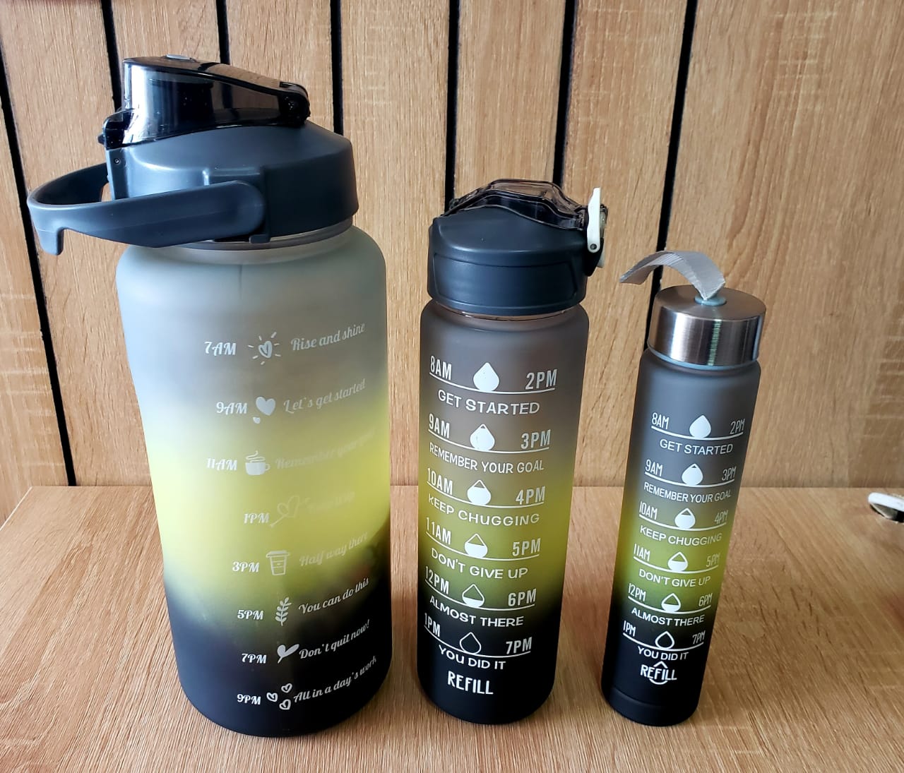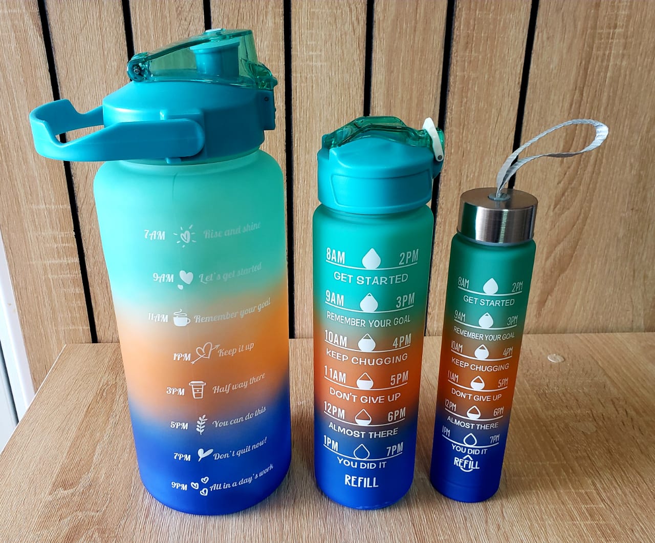 TRIO DE TERMOS DE FRASES MOTIVACIONALES.Juego de tres termos de medidas distintas • Uno de 2 litros• Uno de 900 ml• Uno de 500ml• Dos pitillos• stickers diferentes motivo•